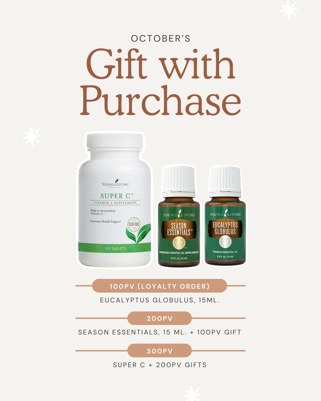 Create a Loyalty Rewards order with some of these favorites and get Eucalyptus Globulus, Season Essentials, and Super C for FREE. PLUS at least 30 points (up to 75!) to use as product credits!